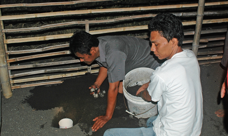 Pemindahan telur penyu ke tempat penetasan semi alami di Pantai Boom.