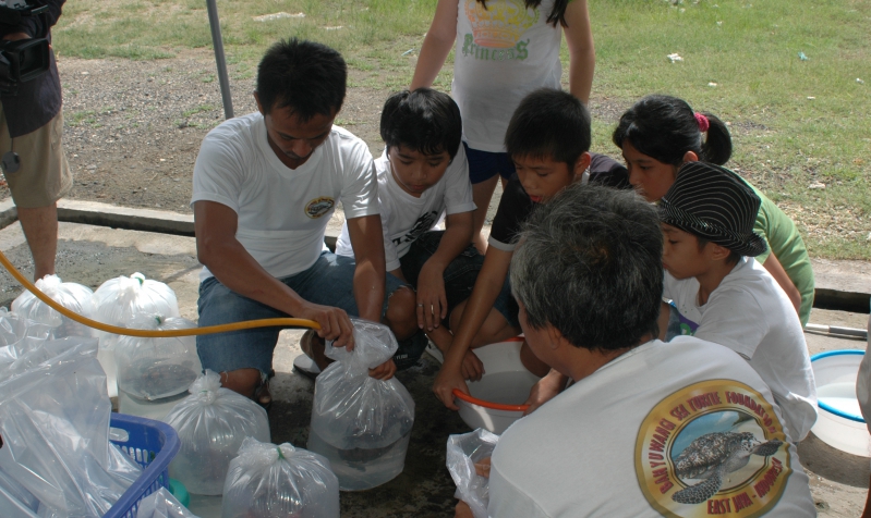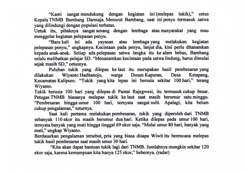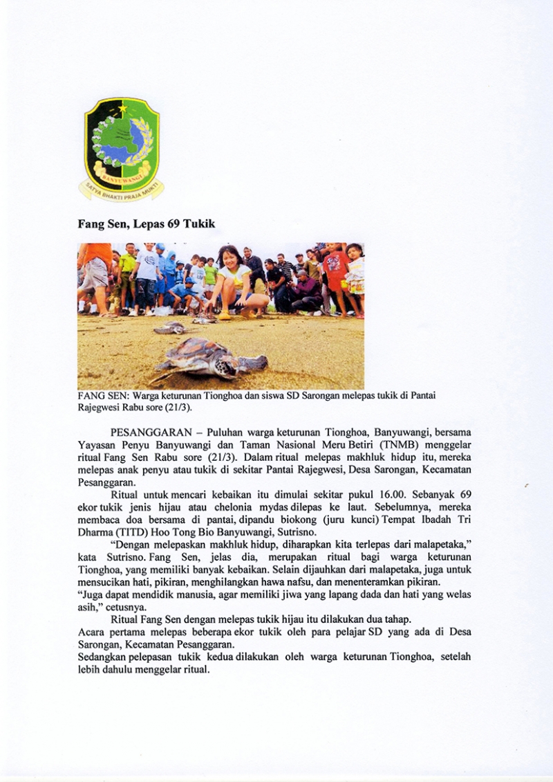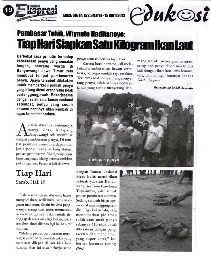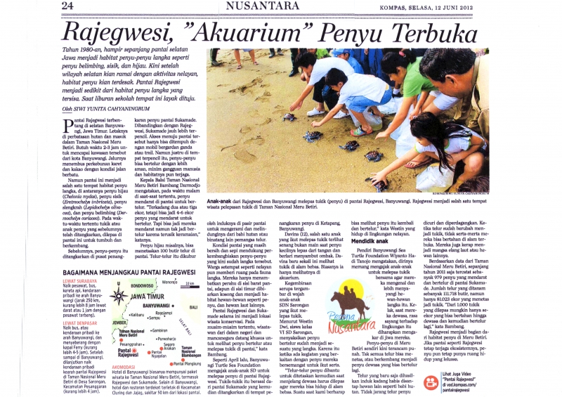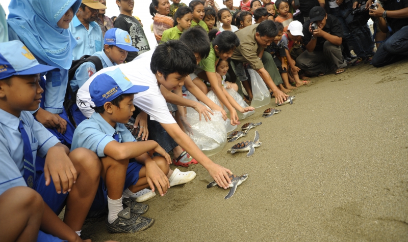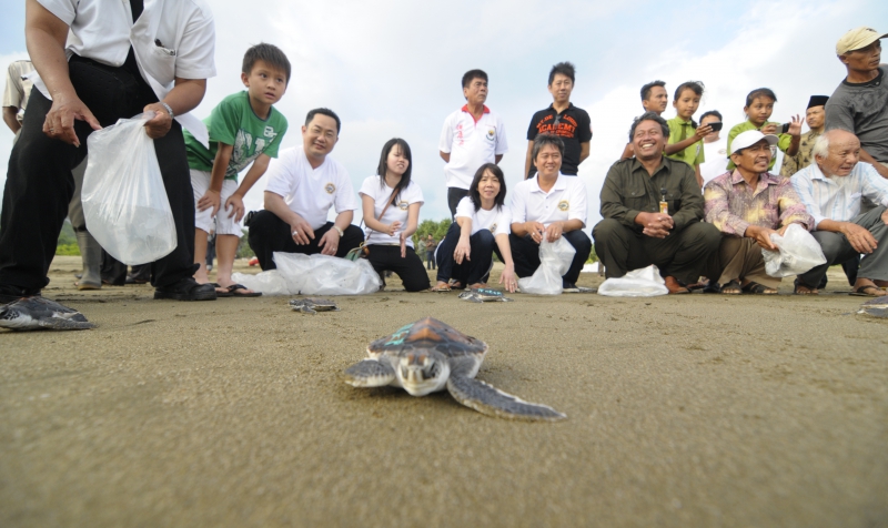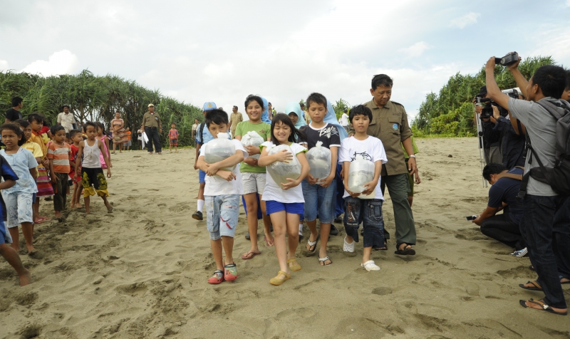 Pelepasliaran tukik pertama diikuti oleh tokoh2 lintas agama Islam, Budha, Kristen, Katholik dan pelajar SD Rajekwesi dan SDK Santa Maria Banyuwangi di pantai Rajegwesi.