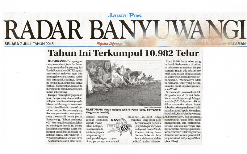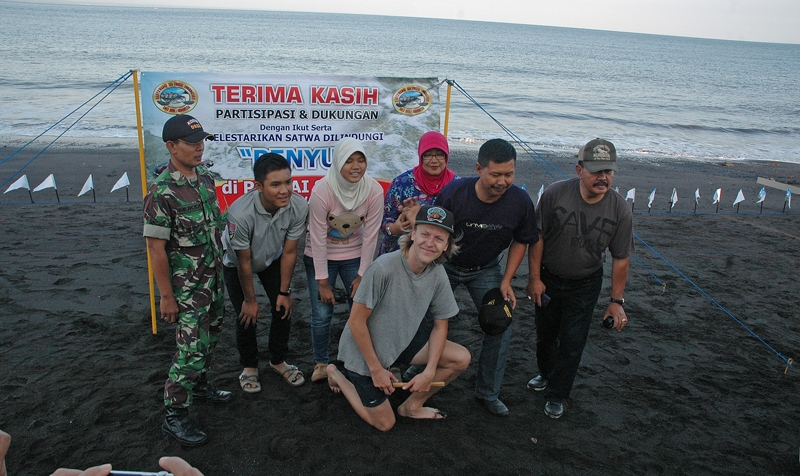 Pelepasliaran Tukik bersama lurah Sobo dan staf di pantai Sobo.