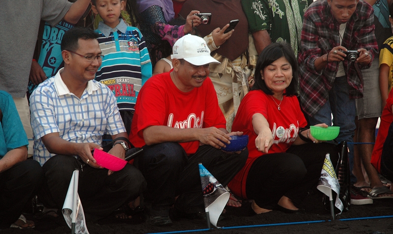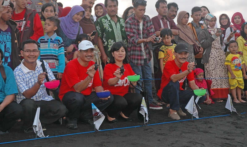Pelepasan tukik bersama menteri pariwisata, kepala dispar banyuwangi, lurah mandar, BBKSDA, komunitas LAROSA, Komunitas KPMB Surabaya dan komunitas BSTF sebanyak 200 tukik di pantai Boom.