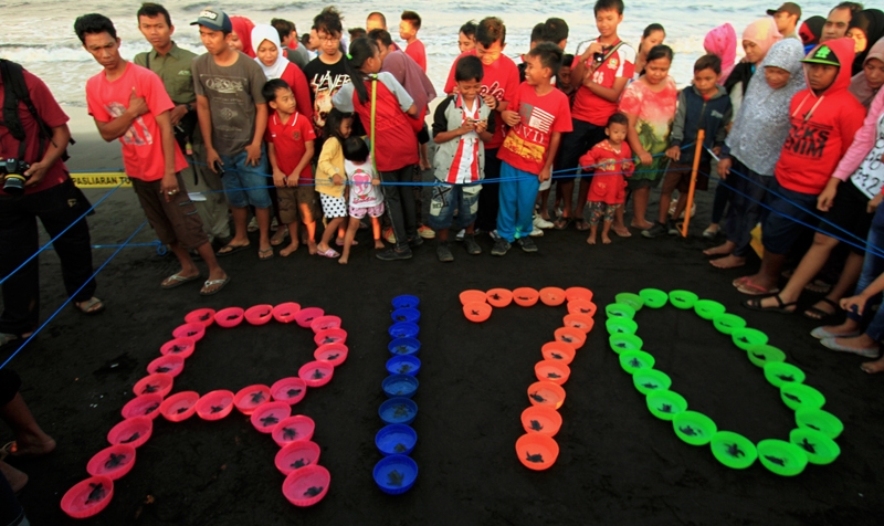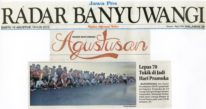 Pelepasliaran 70 Tukik dengan jenis penyu lekang dalam rangka HUT RI ke 70 bersama Paud Belambangan, SMP PGRI, Komunitas @DLIBCrew dan Masyarakat Umum di pantai Boom Banyuwangi.