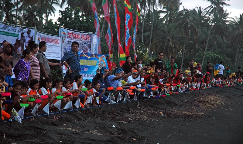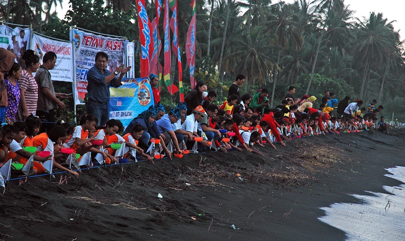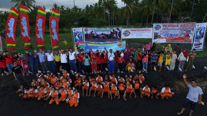 Pelepasliaran 100 tukik dengan jenis penyu lekang bersama siswa SN Klatak di pantai Cacalan Banyuwangi.