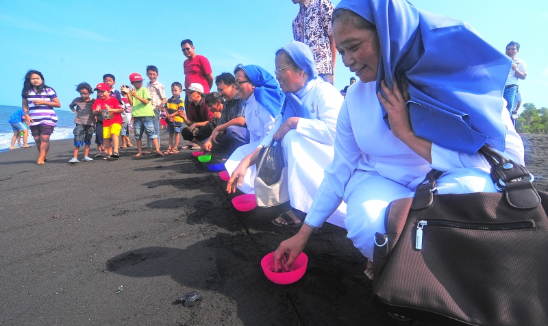 Pelepasliaran tukik di Pantai Boom bersama Diaspora Ikawangi Sejahtera dan Ikawangi Dewata, Ka Bagian Humas dan Protokol Pemkab, Kel Sanggar Genjah Arum serta Pastor dan Suster dari Genteng.