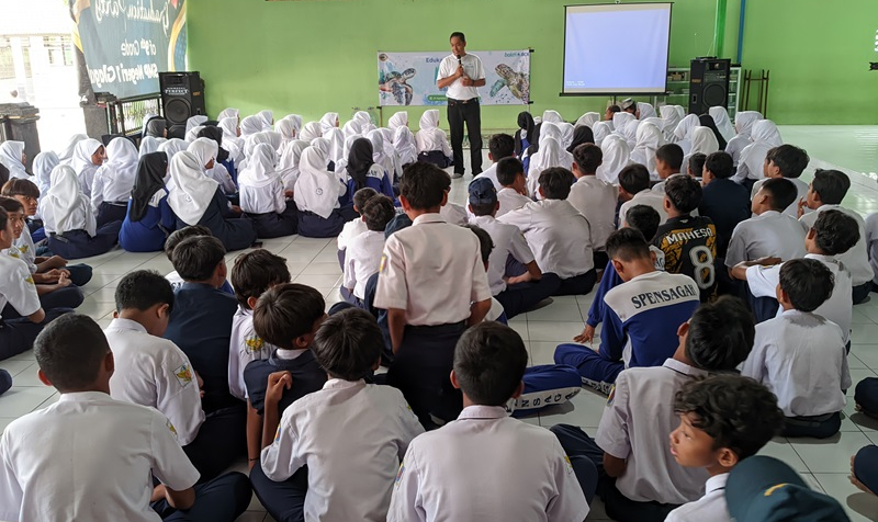 Seratus siswa SMPN 1 Glagah terlihat sangat aktif saat relawan BSTF melakukan edukasi konservasi Penyu. Selasa (27/8) mereka mendapatkan materi seputar ekosistem Penyu, jenis Penyu, predator hingga makanan Penyu.